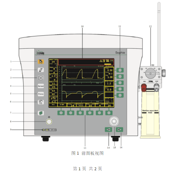 蘇菲新生兒呼吸機(jī)必須放置于提供的移動(dòng)臺(tái)車的支架中央。臺(tái)車前輪配有剎車,防止蘇菲新生兒呼吸機(jī)意外移動(dòng)。2.1將氧氣管路連接到設(shè)備背面的氧[管道接口和墻上的中央氣源插口中。2.2 用空氣管路連接到設(shè)備背面的空ü管道接口和墻上的中央氣源插口中。1.供電電壓范圍在100-240 VAC范圍內(nèi);2.將病人單元連接到蘇菲新生兒呼吸機(jī)右側(cè)面板,并鎖緊固定;5.將Y形接頭、流量傳感器、壓力測(cè)量管和溫度探頭分別連接到病人管路和主機(jī)上,并將病人管路與Sophie主機(jī)可靠連接。6.必須將流量傳感器和Y形接口連接到病人單元背面專用接口:3.2連接電源并打開電源開關(guān),按下開機(jī)按鈕啟動(dòng)蘇菲新生兒幾呼吸機(jī)。濕化瓶中注入蒸餾水時(shí),將瓶擰在一起之前水面切勿達(dá)到“MAX”標(biāo)記位置,否則濕化管沒入水中后,水面將超過標(biāo)記的最大水量:在操作過程中要經(jīng)常檢查濕化瓶的水位。永遠(yuǎn)不要在設(shè)備工作時(shí)拆下濕化瓶!包括濕化瓶在內(nèi)的濕化裝置,在設(shè)備工作時(shí),內(nèi)有150cmH;O的壓力!在使用注射器向濕化瓶?jī)?nèi)注水時(shí),需密切注意,防止壓力將注射器活塞反向推出注射器,從而造成危險(xiǎn)。在操作過程中,只能使用自動(dòng)注水系統(tǒng)或帶注射器的鹿耳接頭給濕化瓶注水用冷水填充可能引起“吸入’體溫度過低”和“水浴溫度過低”報(bào)警。這些報(bào)警可通過關(guān)閉“加熱濕化”菜單的加熱功能大約1秒鐘再打開來抑制。這樣聲音報(bào)會(huì)被抑制30分鐘不論是進(jìn)行連接還是斷開操作,都要抓據(jù)病人單元管路的接頭處而非加熱絲查繞處,否則容易損壞加熱絲。3.3設(shè)備開機(jī)后進(jìn)入自測(cè)模式。3.4系統(tǒng)測(cè)試完成時(shí),屏幕上將顯示“Test-mode fiushedSelect ventilation mode ” 然后可選擇相應(yīng)的通氣模式,氧氣傳感器自動(dòng)校準(zhǔn)。