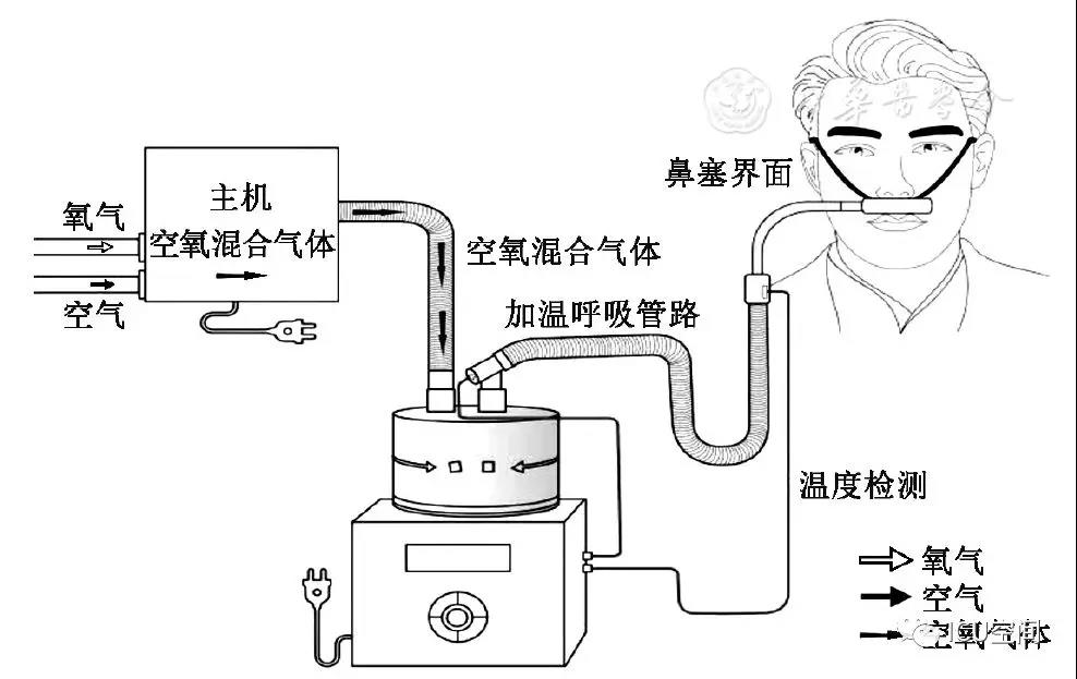 HFNC是指一種通過高流量鼻塞持續(xù)為患者提供可以調(diào)控并相對恒定吸氧濃度(21%~100%)、溫度(31~37 ℃)和濕度的高流量(8~80 L/min)吸入氣體的治療方式。該治療設(shè)備主要包括空氧混合裝置、濕化治療儀、高流量鼻塞以及連接呼吸管路[3]。結(jié)合國內(nèi)和國際通用命名習(xí)慣,本共識(shí)統(tǒng)一采用"經(jīng)鼻高流量濕化氧療"進(jìn)行表述,英文簡稱為HFNC(圖1)。
