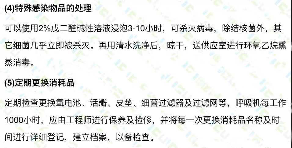 呼吸機(jī)的消毒應(yīng)遵循先徹底清洗,尤其是接觸患者的呼出氣體的部分,如管道、加溫濕化器和呼氣閥等(部分呼吸機(jī)帶細(xì)菌過濾器),可先用清洗劑沖洗,將其中的分泌物,痰痂等徹底清除,然后再消毒。消毒后經(jīng)蒸餾水沖洗晾干備用。經(jīng)化學(xué)消毒劑消毒后的呼吸機(jī)管路應(yīng)用蒸餾水清洗,而不建議用自來水,以免造成不必要的污染。