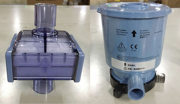 建議在呼吸機的吸氣和呼氣端分別安裝過濾器(如圖 1)。呼吸機自配的過濾器如PB840 呼吸機,呼氣端過濾器被加熱,減少主動加熱濕化時過濾器內(nèi)冷凝水的產(chǎn)生。安裝一次性過濾器時,呼氣端過濾器由于主動濕化導(dǎo)致積水阻力增加時需及時更換。注意:有創(chuàng)通氣呼氣端過濾器需選用疏水材質(zhì)產(chǎn)品,不要以濕熱交換器代之,尤其是長期使用患者。